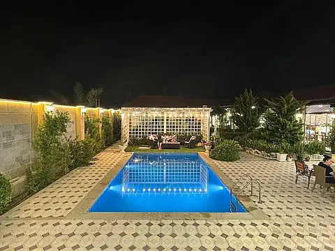 Şüvəlanda esas yoldan 300 metr icəridə 3 yataq otaqı 1 zal 1 mətbəx 1 yay mətbəxi möhdəşəm yaşşılıq sahəsi həyət yani geniş hovuz bisetka mövcudur .