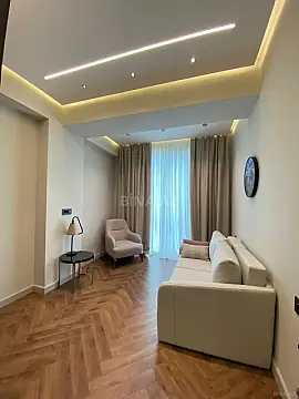 Mənzil **yeni və yüksək keyfiyyətli materiallarla təmir olunmuş**, interyeri isə **xüsusi dizayn konsepti əsasında zövqlə qurulmuşdur.** Bütün mebel və texnika yenidir və istifadə olunmamışdır.