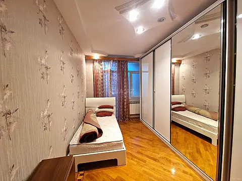 Mərtəbə: 5/12. Ümümi sahəsi 165 kv.m., Parket döşəmə, hündür tavan. KATV, internet-Wi-Fi, 3 Plazma TV. Quraşdırılmış mətbəx mebeli və texnikası (paltaryuyan və qabyuyan maşın, soyuducu). İstilik sistemi “Kombi”, 4 split kondisionerlər. 2 s/q (cakuzi, duş-kabin). Mühafizə olunan həyəti, 2 sürətli liftlər, yerüstü avto dayanacaqlar, uşaq meydançası.