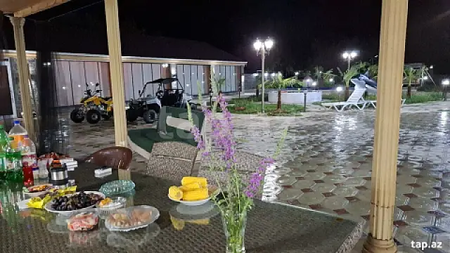 Qəbələ aeroport və dəmir yolu ilə üzbəüz kəndə daqin ətəyi çaya yaxın 60 sot baq evi yeni təmir olunub her şəraiti olan baq evi kirayə verilir. İki yataq otaqi, bir taxt, 4 çarpayı iki açılan çarpayı bir açıla divan və bir yumuşaq divan 3 mətbəx, 2sanuzer 5/10 filtrli hovuz və 3nəfərlik cakkuzi, manqal, optik internet 5 yelləncək. Baqda təbii içində balıq olan göl. çox sakit bə rahat istirahət üçün əla yerdi. Baqda hərbir şərait var. .2 gün artıq qalanda endirim olunacaq. Qiymət avqust ayına görə yazılıb. Nəzərə alsaq qoruq ərazisi olduquna görə ev daqin ətəyi da yerləşir turyan çay yanında (5deq məsafə) evin yolu 500 metr daşlıq yoldu bunu nəzərə almaq lazımdır. Əsas yoldan ümumi 900₼. Evin daq mənzərəsi. Ev sahibi tərəfdən yalnız ailə üçün verilir