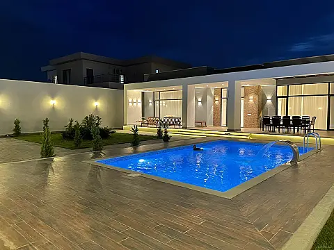 Suvelanda denize 0km mesafede modern yeni tikli yasayish olmayib 3 yataq otaqi 3 sanuzel genish qonaq zali metbex veranda filterli hovuz lejanka manqalni decor aqaclar baq ideal seraitde tehciz olnub icareye verlir buyrub zeng ede bilersiz plus10%