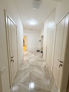 Mənzilin təmirində yalnız yüksək keyfiyyətli İtaliya istehsalı materiallardan istifadə olunub. İnteryer müasir minimalizm üslubunda, zövqlə və incə detallarla işlənib.