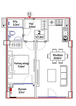 Satılır 2 otaqlı mənzil 47.3 m²