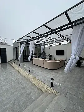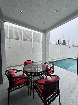 Həyətində: Filtrli hovuz Yaşıllıq sahəsi Söhbətgah İstirahət zonası Manqal Yay qış mətbəxi S/q Qaz, su, işıq daimidir Sənədlər qaydasındadır (kupça)