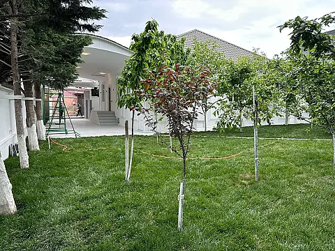 Heyetin de col metbexi Dekorativ agaclar qazonnan temin olunmush yashilliq movcuddur