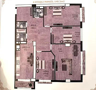 ✔ 4 otaq ✔ Ümumi sahə: 149 m² ✔ 2 sanitar qovşağı ✔ Çamaşırxana otağı ✔ Qarderob otağı ✔ Yelçəkən planlama