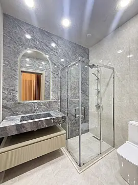 🔹 Tam təchiz olunmuş hamamlar, bahalı aksesuarlarla quraşdırılmışdır. 🔹 Zərif çilçıraqlar və digər aksesuarlar 🔹 Yüksək keyfiyyətli pərdələr 🔹 Pultla idarə olunan giriş qapısı 🔹 Villa və besedka müasir isitmə sistemi ilə təchiz olunub və bütün otaqlarda isti döşəmə mövcuddur