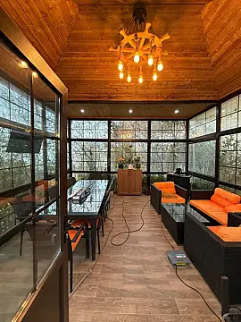 Bağın həyətində besetka (yay oturma sahəsi), böyük filterli basseyn, geniş qaraj və dekorativ ağaclarla əhatələnmiş yaşıllıq zonası var. Yol asfaltdır, ev şəhər infrastrukturu ilə tam əhatələnib və ilboyu daimi yaşayış üçün tam yararlıdır. İstənilən fəsildə rahat və təhlükəsiz şəkildə yaşamaq mümkündür. Qaz, işıq və içməli su dövlət xətti ilə fasiləsiz olaraq təmin olunur. Torpaq çıxarışı və evin kupçası mövcuddur – sənədlər tam qaydasındadır.